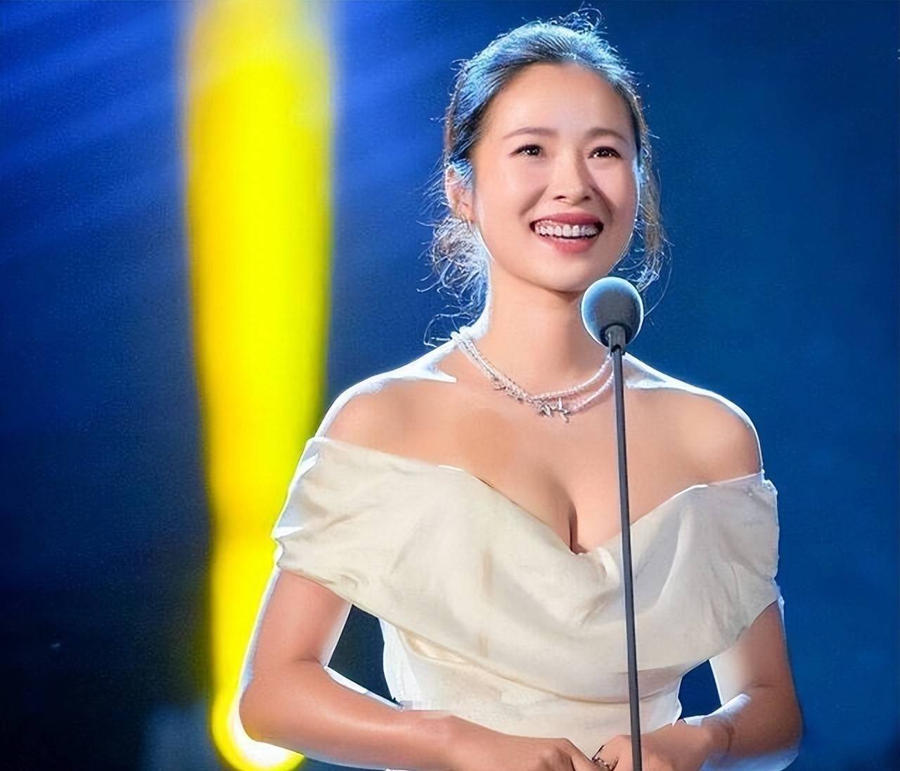 镜头扫过江一燕的脸庞,明显闪过一丝惊愕,但她很快强装镇定走上台接过奖杯。